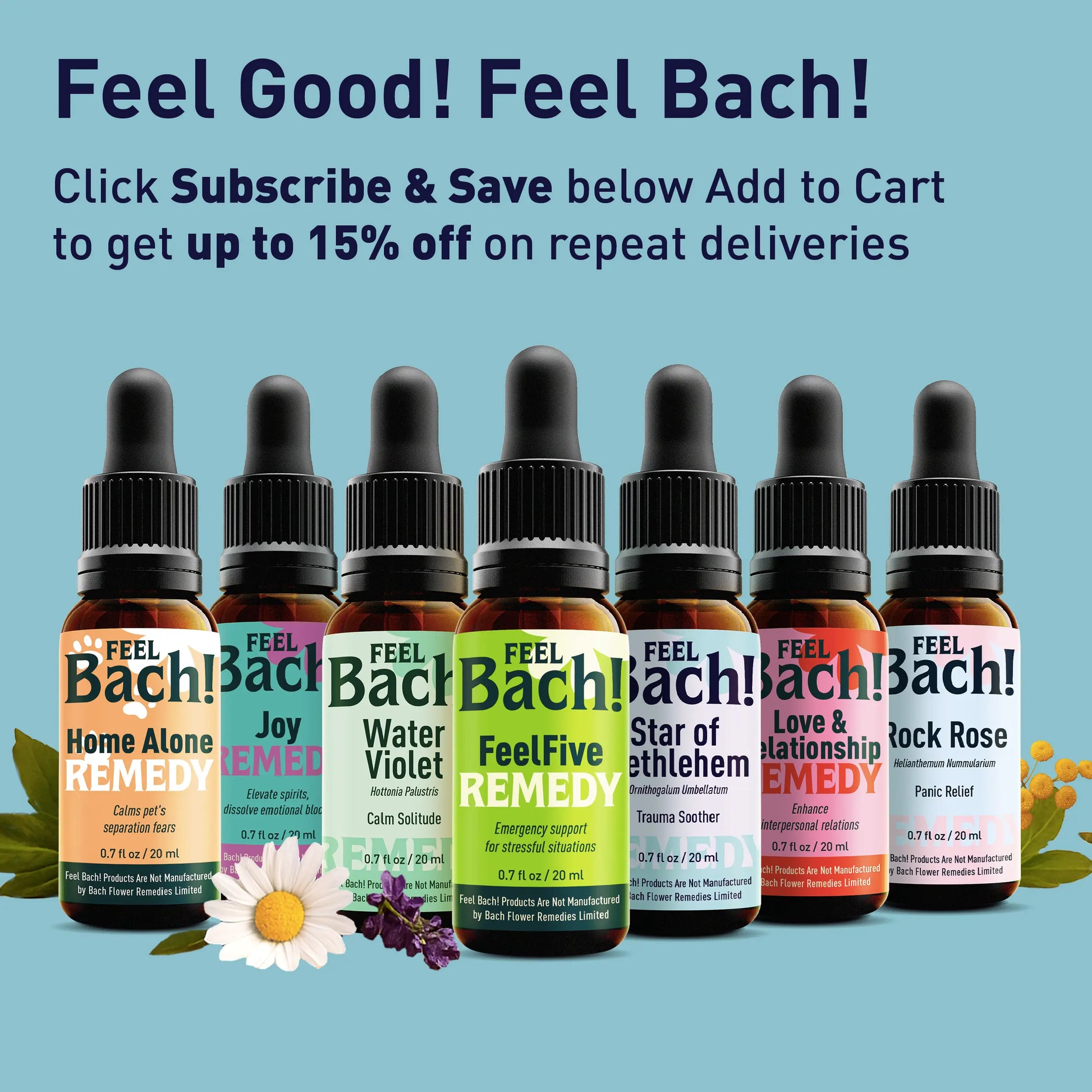 Feel Bach™ remedies are 100% natural, made with flower essences and free from additives or synthetic ingredients.